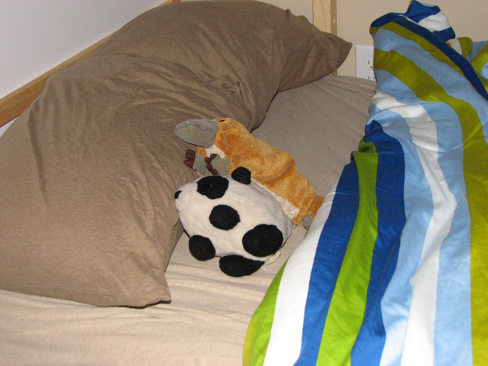 Before New Year's, we went down to the beach. I found a good bedspread to practice my camouflage skills on, though Strange Panda stuck out a bit too much.